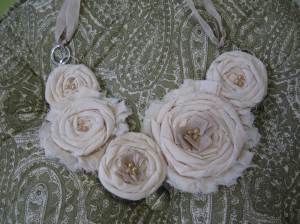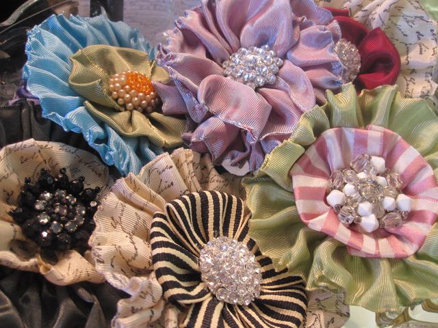 Our ribbon class filled up quickly last time so if you want to reserve a spot in our next class, Ria will be teaching a beginners ribbon flower class on Thursday morning (9 am) on April 28th. Cost of the class is $15 + 5 materials fee. You will make 3 ribbon flowers and Ria will find out how many of you want to take an advanced class to make the flower necklace shown below.